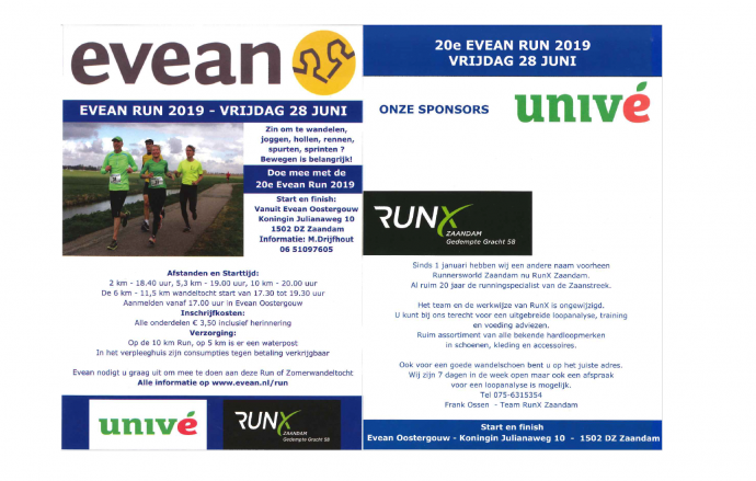 Bekijk hier de volledige versie van onderstaande flyer Evean Run 2019. De volgende 21ste runvrijdag staat gepland op 26 juni 2020. Ben jij er ook (weer) bij?