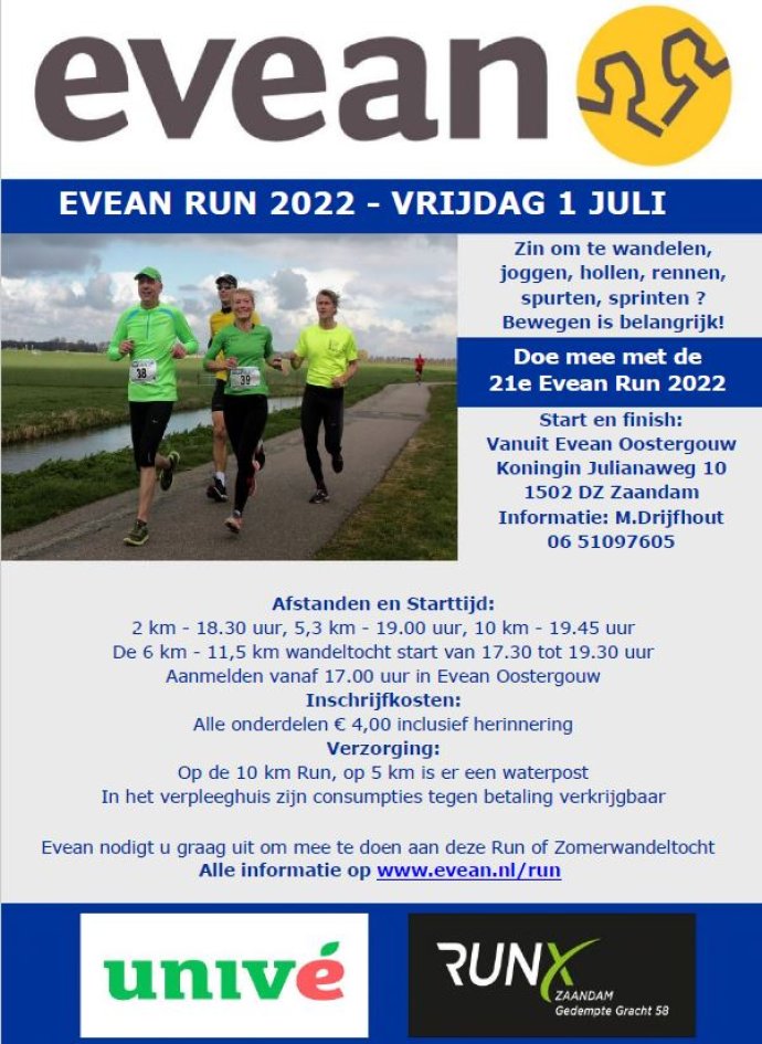 De 21e editie van de Evean Run is vrijdagavond gewonnen door Zaandammer Jeroen Kramer, hij volbracht de 10 km in een tijd van 34.40 min, bij de dames won Eline Langeveld in een tijd van 40.38 min, bij de heren was voorin in de eerste kilometers vooral Alex Vink, die de latere winnaar Jeroen Kramer het nog wat lastig maakte, maar op de eindstreep was het gat ruim een minuut (35.46 min), bij de dames Eline Langeveld, zij had ruim 2 min voorsprong op nummer twee Jill Brantenaar, die met haar tijd zelf een Pr liep van 42.47 min. De 5,3 km bij de heren was voor Rachid Mohammadi (18.23min) die deze afstand nu al 4 x achter elkaar gewonnen heeft, en bij de dames Jamie van Son (22.52 min) totaal deden er 62 hardlopers/wandelaars mee.