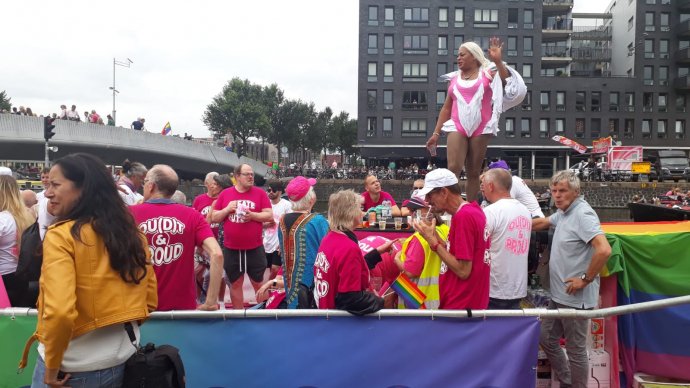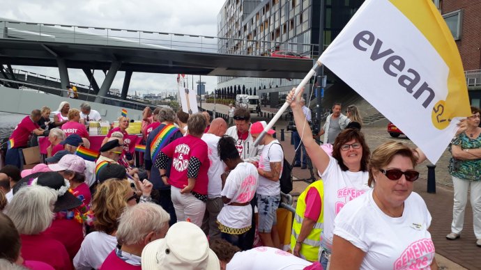 Afgelopen zaterdag 3 augustus voer de Roze 75+ boot voor de vierde keer mee met de Canal Parade. Voor Evean en haar bewoners en begeleiders was het de derde keer dat zij mee gingen op de boot van COC Nederland. Het doel: lesbische, homo-, biseksuele, transgender en intersekse-ouderen van boven de 75 een onvergetelijke dag bezorgen! En aandacht vestigen op het thema ‘Remember the past, create the future!’ “Dat is gelukt”, aldus Coördinator vrijwilligers bij Evean Carleen Lebens. “Het was een waanzinnige dag, met een fantastische organisatie!”